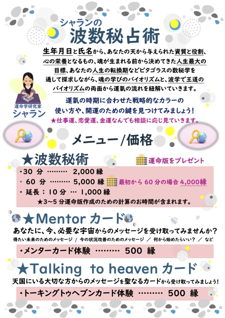 こんにちは。 占術家の“シャラン”です。 ピタゴラスの数秘学と波学を独自に掛け合わせたオリジナルな占術を展開しています。